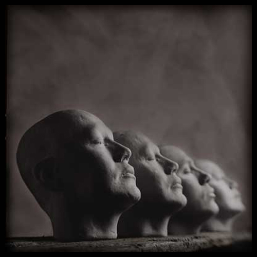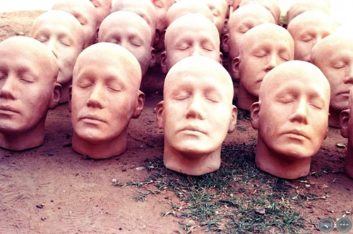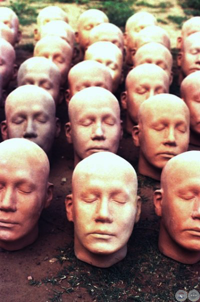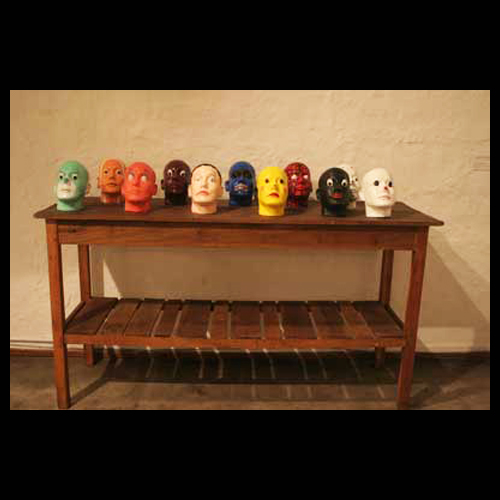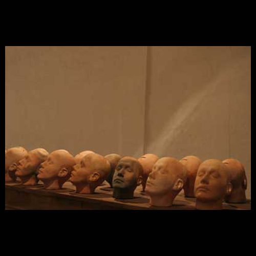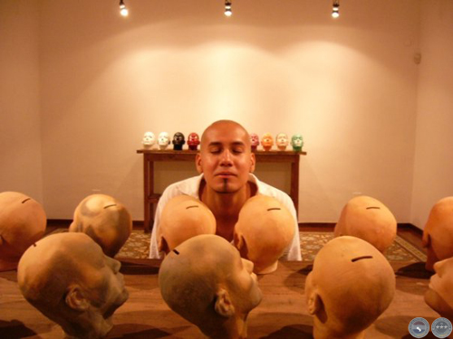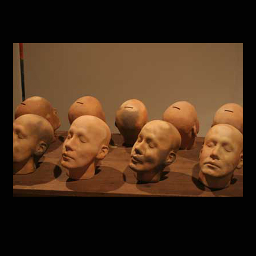 Parte de un calco de su propia cabeza y, siguiendo el destino de la reproducibilidad aregüeña, lo reitera serialmente y lo convierte en alcancía, en recipiente vacío que aguarda su lleno difícil. Este gesto, relacionado con la producción de mascarillas mortuorias, entraña de por sí una maniobra dramática: la auto-clonación, el plagio multiplicado de la propia expresión, la negación de la singularidad del sujeto diluido en la ronda del rito colectivo o alienado en el círculo del ahorro, la órbita de la mercancía.