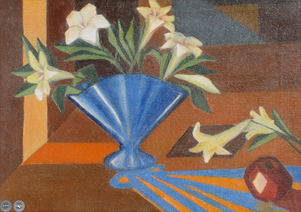 “Al observar la temática elegida para la representación, nos encontramos con una vasta gama de situaciones tomadas de la realidad cotidiana: composiciones realizadas con objetos varios de pertenencia de la artista como su caja de pintura, su paleta y pinceles, o el bolso de la compra diaria, flores y hojas del jardín familiar, etc. En todas las pinturas se siente una alusión a la mujer sin representarla directamente, “una ausencia presente”, temática que más adelante irá apareciendo y que desarrollará con insistencia” (extraído de William Paats Martínez: “EL MUNDO IMAGINADO POR OLGA BLINDER: SUS PINTURAS”, AECI, Asunción, Paraguay, 2007).