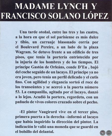 - Madame Lynch! -exclamó el príncipe entre asombrado y cortés. Besó la mano de la dama y quedó mirándola en silencio. Recordaba una carta que esta señora le había dirigido, quince años atrás, allá por marzo de 1870, solicitando "la protección del Serenísimo Conde D'Eu para sí y para sus hijos menores".