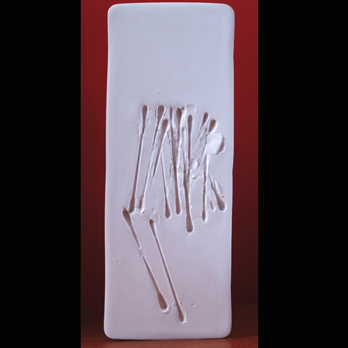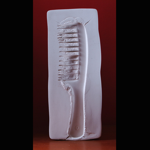 "(...) La marca (I). Los objetos rutinarios impresos por Bettina Brizuela ya no son ellos mismos sino su huella, su marca, su ausencia vuelta señal de su propio ser en retirada. Han sido impresos en lingotes de yeso y desprendidos luego. Y lo han sido en forma violenta: incrustados con violencia y con violencia arrancados. Sus imágenes no son sólo el sello de un objeto estampado sino las señales de un despojo y una herida: deformadas, aplastadas, presentan en sus rebordes hinchados, sus fracturas y sus cráteres, los estigmas de un apremio arbitrario. -- La marca (II). Impresos en yeso, los objetos han perdido sus etiquetas, los rótulos comerciales. Han perdido sus nombres, aquellos que los asignaba un empleo y un valor de marca. Ahora ya no se sabe se esta incisión desbordada corresponde a la presión de un cuchillo o una navaja y, lo que es más grave, no se sabe la cotización que refrenda el logo. Pero, también, se desconoce la firma, la corporación responsable de su diseño y su estilo, los poderes de su insignia publicitaria. Se ha borrado la distinción que confiere la propaganda, el aura que acuña el mercado. Desmarcada, anónima, cada cosa ya no puede hablar de sí: remite a otra cosa. Muestra el vaciado de una función fantasmática. Restituye, fugazmente, la inocencia original de un uso privado. -- La instalación. Los objetos, sus ausencias, están presentados sobre mesas largas y delgadas, pura madera despojada de todo lustre y ornato. Así exhibidas, las blancas placas de yeso despiertan el tono lapidario y un tanto luctuoso que convoca el mármol, convocado a su vez en su recuerdo por la pasta polvorienta que incauta su lugar solemne. Así ordenados, clasificados según un orden ignorado y sobre largas mesas idénticas, los trozos sugieren el trazado taxonómico de un laboratorio demasiado aséptico y la habitación entera evoca un espacio esterilizado y quirúrgico. En su centro, el yeso recuerda sus cometidos primeros, deviene ortopedia que apuntala el secreto de cada objeto destinado al hacer humano y corrige la distorsión fetichista de las marcas. Restituye el "estar a mano", carácter que, según Heidegger, adquieren las cosas en el círculo extraño del sentido".