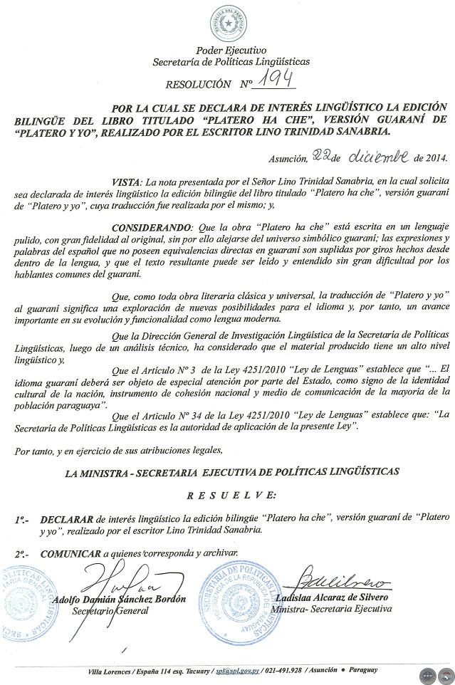 Gracias a la labor y gran esfuerzo del Lic. Lino Trinidad Sanabria que ha realizado un “trabajo gustoso”, como diría el Nobel Juan Ramón Jiménez, puede ver la luz este Platero traducido en edición biligüe: español - guaraní
