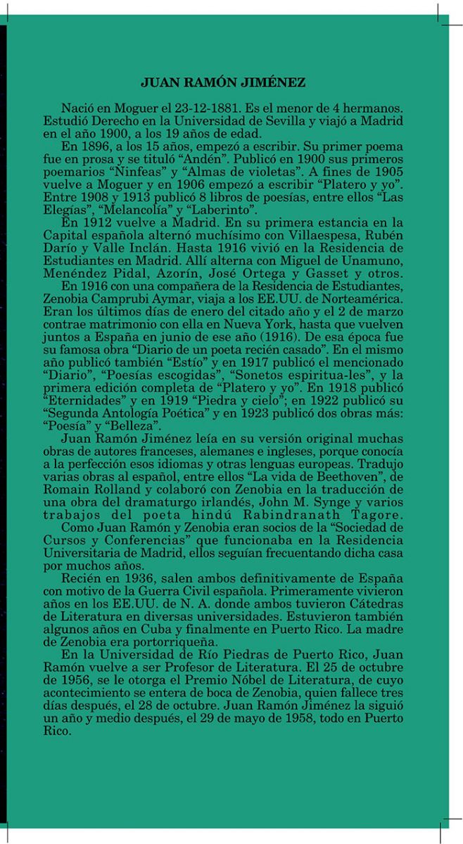 I. El valor auténtico y significativo de una creación artística universal, como innegablemente es la obra Platero y yo, tan reducida como preciosa -una verdadera “joya de la literatura española”- del celebrado poeta en verso y en prosa, JUAN RAMÓN JIMÉNEZ (1881-1958). En 1956 recibió el Premio Nobel de Literatura en dramáticas circunstancias. “Enfermo y debilitado por las profundas crisis nerviosas que le zarandeaban sin piedad desde hacía ya unos años, recibió esa noticia de labios de su esposa agonizante, Zenobia Camprubí, que moriría pocos días después. Juan Ramón, sin el apoyo espiritual y el entusiasmo para vivir que tantas veces encontró en su compañera, apenas sobrevivió un año y unos meses a la ausencia de Zenobia”.