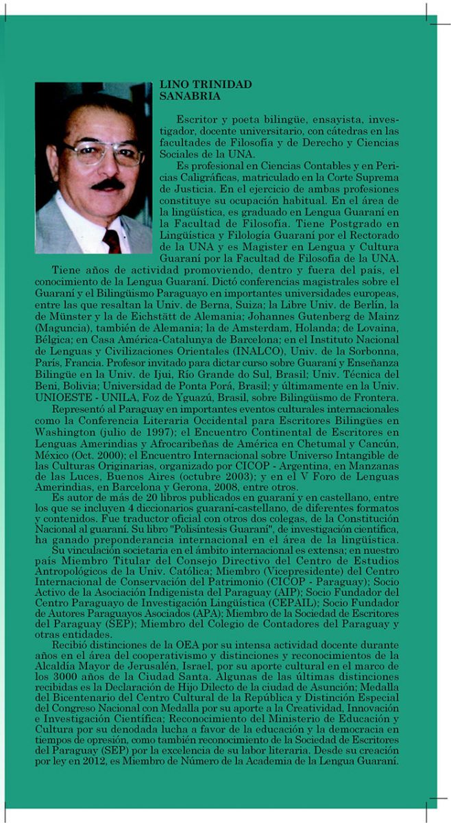 Sobre el idioma guaraní con el que podemos ahora leer, gratificándonos, por obra y gracia del Lingüista y Científico Lino trinidad Sanabria, un paraguayo guaraniólogo eminente, porque dedicó toda su vida al estudio, investigación y aplicación del Guaraní en cualquiera de sus formas, oral y escrita: como son los centenares de trabajos publicados, libros (especialmente diccionarios); artículos, charlas y conferencias a granel, en el ámbito nacional y también internacional por numerosos países europeos; una larga actividad docente durante cinco décadas siempre en su especialidad y muchas menciones y reconocimientos. Además, lo más valioso son sus numeroso trabajos de investigación. Citaré como más sobresaliente su “Gran Diccionario Avañe’ẽ Ilustrado” Guaraní-Castellano y viceversa. Este “libraco” elegante y en colores –Con nuestra infaltable bandera paraguaya– redactado y hecho en Paraguay, aunque impreso y editado en Bogotá Colombia, mereció ser colocado en una colección entre los cien libros más importantes del todo el mundo en todo sentido –En contenido y en presentación que propicia una casa editora en Alemania: ¿Mba’etekopa lo mitã…? viva nuestra producción nacional–