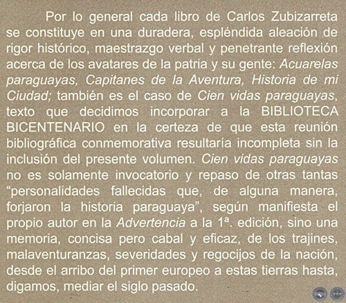 Por lo general, cada libro suyo se constituye en una duradera, espléndida aleación de rigor histórico, maestrazgo verbal y penetrante reflexión acerca de los avatares de la patria y su gente: Acuarelas paraguayas, Capitanes de la Aventura, Historia de mi Ciudad; también es el caso de Cien vidas paraguayas, texto que decidimos incorporar a la BIBLIOTECA BICENTENARIO en la certeza de que esta reunión bibliográfica conmemorativa resultaría incompleta sin la inclusión del presente volumen. Cien vidas paraguayas no es solamente invocatorio y repaso de otras tantas "personalidades fallecidas que, de alguna manera, forjaron la historia paraguaya", según manifiesta el propio autor en la Advertencia a la 1ª. edición, sino una memoria, concisa pero cabal y eficaz, de los trajines, malaventuranzas, severidades y regocijos de la nación, desde el arribo del primer europeo a estas tierras hasta, digamos, mediar el siglo pasado.