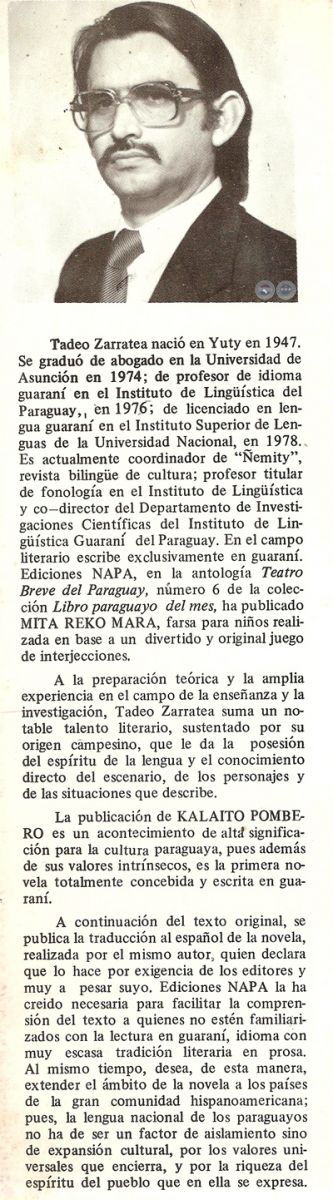 Mba’eichaguátepa aipo guarani paraguái. Mamótepa upéva jajuhu, térä ñahendu. Péicha omba’eporandu tapicha oikuaasemivéva. Che umívape katuete ambohovái péicha: 1) Reikuaa haguä rehenduva’erä umi paraguájo tujápe, umi ojehesape’amíva’ekuépe, heko paraguaietéva ha oikóva umi táva yma rupi, ÿrö katu; 2) Releeva’erä haipyre oïva ha ohkriviva’ekue ñande poetakuéra guaraníme. Ha katu ko’ágä amoï mbohapyha, atïetemi ramo jepe, ha’e umívape: yma 1981 guive jareko tembiecharärö ko novéla kóva, tenonderete ha ha’eñomíva, ojehaiva’ekue guarani paraguaietépe. Ajevérö, mayma tapicha oikuaaséva mba’eichaguápa aipo guarani paraguái, tolee Kalaíto Pombéro, ohendu haguä osyryry ramo hína heko teetépe ha inaturálpe porä. Iporäite niko añete la ñe’ë poty ha hetaite mba’e oreko, péro niko upépe noïri la ñe’ë pe tapicha aty oiporuháicha, upéva jajuhu hína ñe’ë syrýpe, prósape. Ajevérö niko tapicha oguenohëséva tembiapopy iporäva ñe’ë syrýpe, oje’ideava’erä ha hi’ári oiporu kuaa va’erä iñe’ë opaichaite.