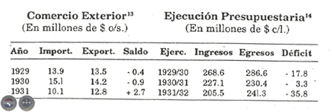 Con la contracción del comercio interior y la disminución de los ingresos aduaneros, las recaudaciones fiscales se redujeron en forma significativa y obligaron al Tesoro a una severa restricción de sus gastos. "La crisis económica, refirió la memoria presidencial de 1932, ha impuesto la necesidad de disminuir todos los gastos del Estado y de suspender varios empleos públicos". Pero aun con esas economías, el déficit fiscal se hizo crónico.