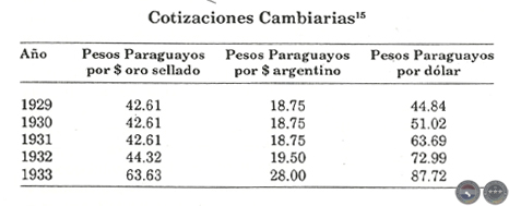 El peso de curso legal mantuvo inicialmente una aparente estabilidad, reflejada en una relación constante con el peso argentino. Pero como esa moneda entró en una escalada depreciativa con relación a las demás monedas, forzosamente producía la desvalorización correlativa de la moneda nacional con relación a las otras monedas. De 1929 a 1933, la cotización del dólar en moneda paraguaya prácticamente se duplicó.