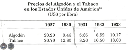Las cifras siguientes muestran la intensidad de la caída en los mercados internacionales de los precios de los dos principales productos primarios de exportación del país. El precio del algodón cayó en 1931 a poco más de la cuarta parte de la cotización de 1927. Esta caída dramática de los precios externos significó una caída aún mayor en las cotizaciones locales.
