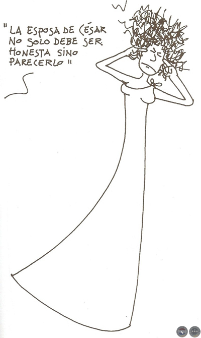La esposa era Pompeya, mujer relativamente honesta, quien, cansada de las frecuentes ausencias del guerrero esposo, en día de fiesta a la Bona Dea, una de esas diosas que servían de pretexto a los romanos para farrear unos cuantos días, dio amorosa acogida en la villa romana a su amigo Clodio, que entró como un travestí, y aún así fue descubierto. Cesar se pichó. Repudió a la pobre Pompeya y dijo la famosa frase que se adapta perfectamente a los usos en boga: "la esposa de César no sólo debe ser honesta sino parecerlo".