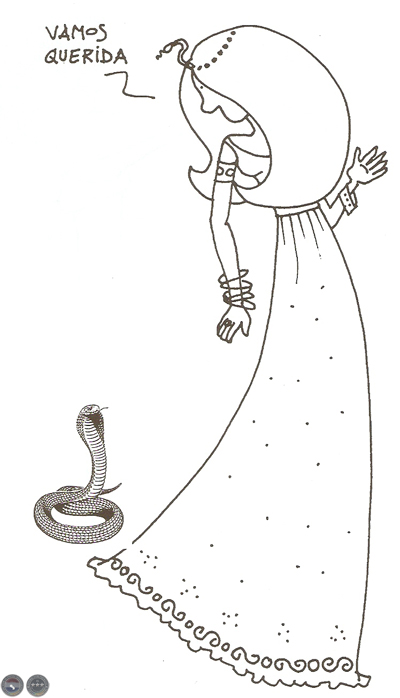 En este ámbito se desarrollaba la vida conyugal. El Primer Hombre contento de sus destrezas amatorias, comenzó a dejar sola a Eva dedicándose a tareas propias de aquellos hombres de sexo masculino. Evita, lejos de la mirada adánica entabló una peligrosa relación amistosa con la víbora, ésta la instruyó acerca de las virtudes de la inteligencia, de la igualdad entre hombres y mujeres y de las bondades de un orgasmo de verdad. Ella comenzó a cuestionarse su status en la Creación. No estaba satisfecha, pensaba que a su cabeza le faltaba cerebro, a pesar de su sedosa caballera, que perezosamente trenzaba y destrenzaba. Así le confesó a su única amiga, la que le aconsejó probar la fruta del Árbol de la Ciencia.