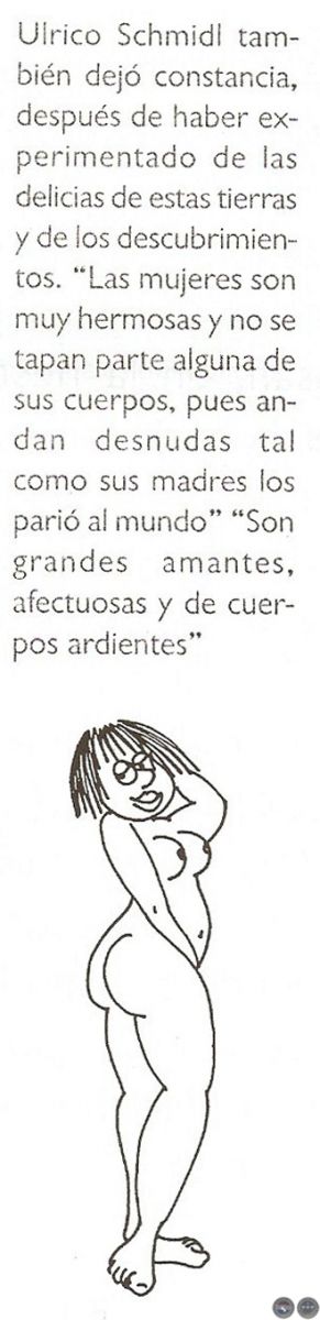 Ulrico Schmidl también dejó constancia, después de haber experimentado de las delicias de estas tierras y de los descubrimientos. "Las mujeres son muy hermosas y no se tapan parte alguna de sus cuerpos, pues andan desnudas tal como sus madres las parió al mundo" "Son grandes amantes, afectuosas y de cuerpos ardientes", fanfarronea el bávaro.