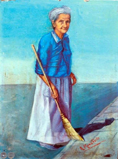 Retrato de la “señorita” Manuelita Peña, limpiadora de la Catedral de Asunción desde comienzos del siglo XX. Ella colaboró con las autoridades eclesiásticas en el esclarecimiento de la identidad de la Candelaria de Capiatá depositada en la Catedral durante la Guerra Grande. Pintura sobre tabla de monseñor Aníbal Mena Porta, segundo arzobispo de Asunción (1889- 1977). Museo Juan Sinforiano Bogarín- Asunción. (Foto: Ramón Duarte Burró).