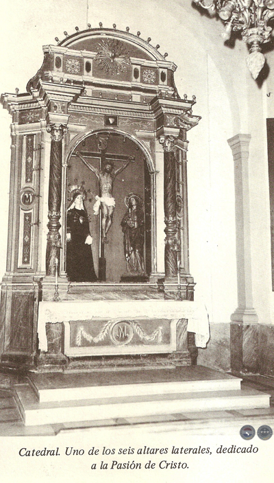 "Los retablos colaterales se han abandonado y se mudaron de laIglesiade los expatriados. Cuatro retablos colaterales y se vendieron los viejosde la Iglesia Catedral. Barandillas que fueron del Colegio y se colocaron en los cuatro huecos de las Naves laterales para separar los Altares colaterales todos de madera y balaustres torneados".