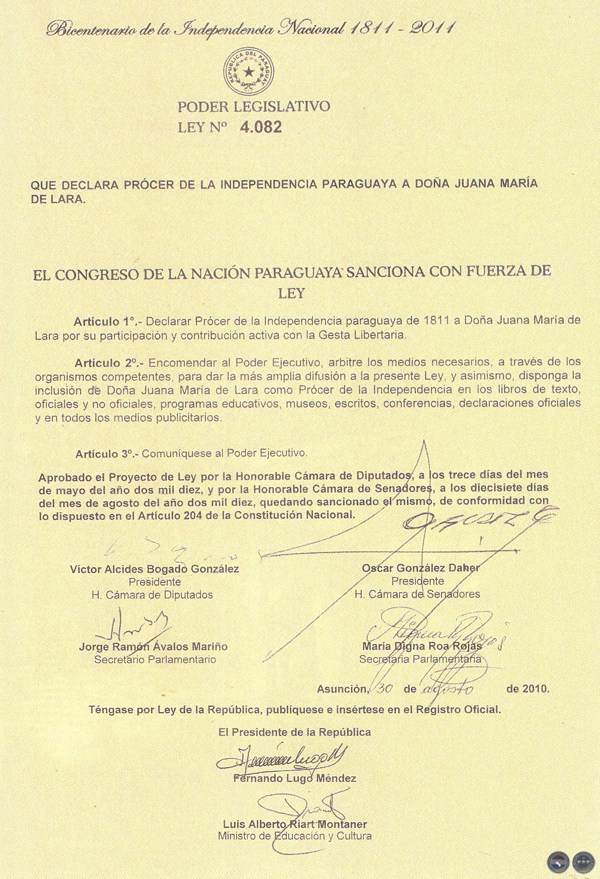 La Ley, por la cual se declara Prócer de la Independencia paraguaya de 1811 a Doña Juana María de Lara se difunde en la Gaceta Oficial de la Presidencia de la República, con el número 4.082 del año 2010. Dicha Ley recomienda que se disponga la inclusión de la Prócer en los libros de texto oficiales y no oficiales, programas educativos, museos, escritos, conferencias y declaraciones oficiales.