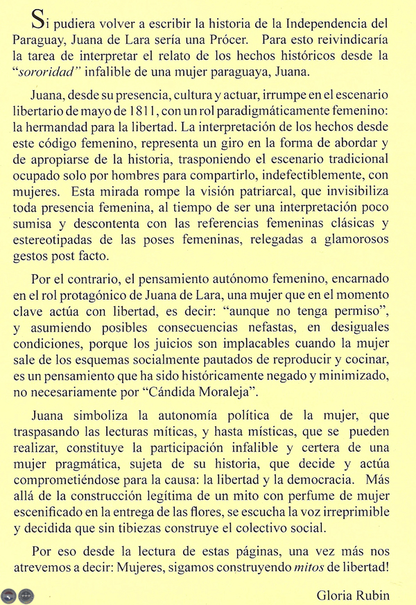 Generaciones de niños y sobre todo niñas, han aprendido en los textos de las escuelas la presencia de Juana de Lara en la Gesta libertaria de 1811, pero siempre descripta como una madrina, como semi prócer y no como protagonista a la altura de los próceres masculinos. La manera como se ha repetido históricamente esa transmisión es reiterar, por acción u omisión, ese mecanismo invisibilizador y finalmente ingratamente desigual hacia el valor de las mujeres como parte esencial de la historia paraguaya desde sus inicios como nación.