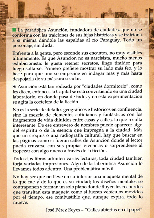 Al dar una mirada narrativa a la siempre compleja Asunción se multiplicaron perfiles y ángulos, líneas y curvas. Al tramar las imágenes y las ficciones en el salón de espejos deformantes que es la imaginación, terminé escribiendo dos novelas y una treintena de cuentos que abrieron sus calles alternativas, alejándose con su propio argumento bajo el brazo, independizándose del barrio novelístico.