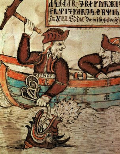 Thor lucha contra la serpiente Yormund (o la Serpiente de Midgard), que es Mbói Tu’i, la gran serpiente en la cosmogonía guaraní. Manuscrito islandés del siglo XVII.