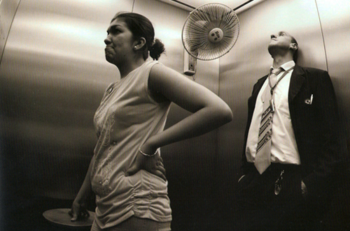 En la gélida caja de metal no se puede escapar de la coacción que sugiere el no lugar. No hay otra alternativa a los cientos de peldaños, aunque éste no lugar intimide, oculte, sobrecoja, obligue cortesías reformulando vínculos. Allí se participa de impensados silencios, de conversaciones. Este espacio de encuentros es, extraña e inversamente, de desencuentros. Es entre sus paredes de menos de tres metros cuadrados, donde los espejos sólo reflejan espaldas o, de vez en cuando, en descuido, una mirada, el control del rouge bien pintado en los labios y, sólo con transgresores, un beso o una caricia.