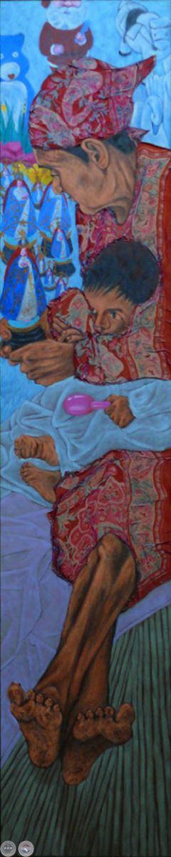 “La vendedora de vírgenes” óleo y collage sobre tela 200×40 cm 1993 | Colección privada, Paraguay