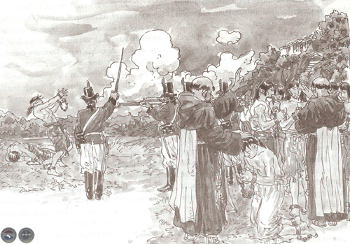 TODOS LOS DESTINOS.... (Fusilamiento de los patriotas en los bajos de la actual Plaza de la Independencia. A partir del 17 de Julio de 1821 fueron ejecutados en grupos de 8 por día, uno tras otro. En la imagen se observa, entre los que esperan su turno de muerte, a dos sacerdotes (confesores). El pelotón se componía de no menos de cinco tiradores y un oficial)