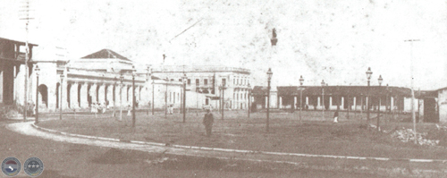 El nutrido espacio de la Plaza Mayor por el que circularon tantos y tantas veces en la noche del 14 de Mayo y los días siguientes. La fotografía fue tomada hacia finales del siglo XIX desde el atrio de la Catedral, cuyo campanario saludó la toma de los cuarteles. A la derecha puede verse una de las galerías del Cuartel de la Ribera. Hacia la izquierda, la fachada de la Policía, lugar en el que -según Julio C. Chávez- se alzaba el Cuartel de Artillería. Y en el medio, al fondo, la Casa de Velasco.