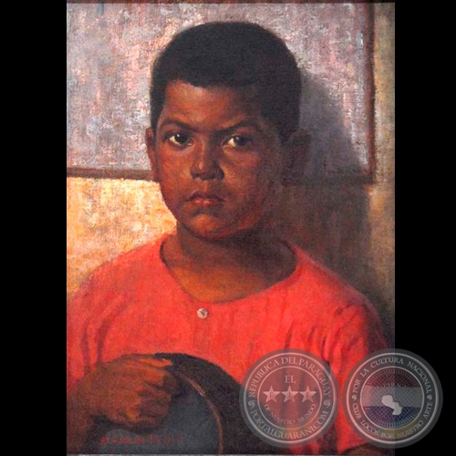 FIGURA: Al parecer en ella vuelca todo su entusiasmo y demuestra su dominio de la técnica. Con sus obras ha creado un tipo invariable de mujer, de mirada ardiente y concentrada, fuerte y melancólica a la vez. Para lograrlo pide formas al pintor español Julio Romero de Torres, de quien dice la copla que "pintó a la mujer morena con los ojos de azabache y el alma llena de penas". Sus mujeres son morenas como la tierra en las que vierte su propia tristeza y sensualidad, con técnicas antiguas y modernas a la vez. El no fijó sus ojos en la clama de calidad, igual en todas las partes del mundo, sino en aquella mujer amasada con la originalidad de cada pueblo, con sus pobres vestidos y su rebozo. Todas ellas tienen un gesto suave y mudo, corno en la joven del abanico (de la Colección Cabrera Cardús), con transparente manto negro. Se destaca la figura sobre el fondo del Lago Ypacaraí, con tonalidades ocres, negros azulados y grises, colores que habrían podido haber ensombrecido la obra, pero que actúan para destacar mejor las pinceladas de vivo color del rostro y el paisaje del fondo. También Romero de Torres pintó una obra semejante.