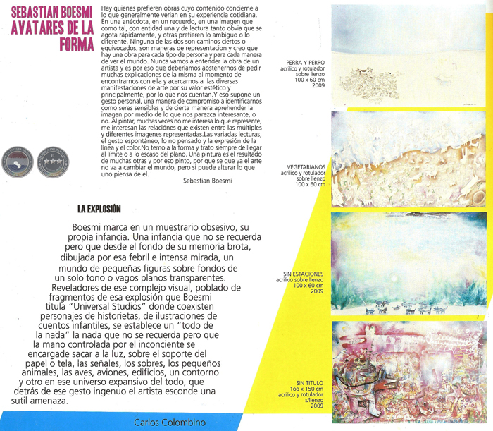 Para este pensador, la marcha de la forma responde ante todo a una necesidad de ser interna y autosuficiente, cuya historicidad estaría más allá de la ley de causa y efecto. En este sentido, el conjunto de imágenes que presenta Sebastián Boesmi responde mejor a objetivos expresivos particularísimos que a modos remanidos de la forma historicista. De ahí que lo representacional, como contenido histórico, y separado de su tradicional oficio especular, hace visible el universo desbordante de la forma como entidad en plena metamorfosis, siguiendo la pauta dictada más bien por lo que rige a la fantasía visual y a los hábitos contemporáneos de la mirada: discontinuidad, fragmentación, dislocación, superposición, virtualidad...; elementos clave que a la larga acaban por definir el sostenido desafío entre lo ambiguo y lo definido como norma formalizadora substancial.