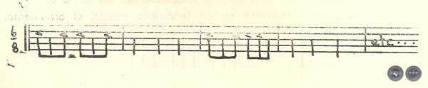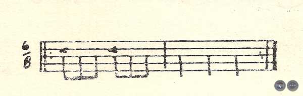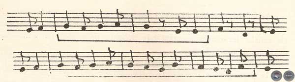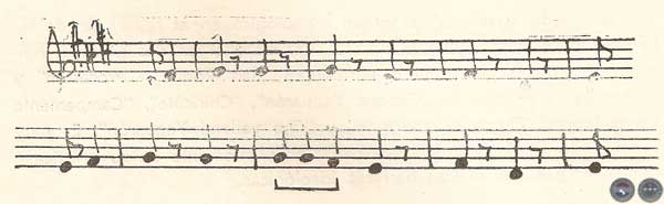 Nótese la presencia predominante de los intervalos de cuarta justa (Fa = — Si) la melodía requiere una previa sucesión de notas constitutivas de la escala, como su número, colocación, afinidades y concordancias recíprocas no responden a una ley universal absoluta, esto explica la inmensa variedad de sistemas musicales. La presencia constante de una sucesión continua de notas sin grandes saltos, se encuentra muy esporádicamente. En forma bastante sistemática tenemos solamente en los siguientes fragmentos: