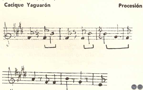 — Hemos puesto la "armadura" de clave en la tonalidad del mimby de los peteke (o sea Mi Mayor), aun cuando en la mayoría de los casos no vienen utilizadas todas las notas indicadas.