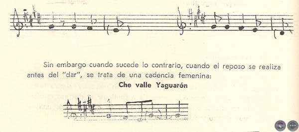 Las cadencias de terminación masculina suceden cuando el reposo adviene en el acento inmediato. Otra de las características fundamentales del presente repertorio musical es que las terminaciones en todos los casos (exceptuamos "Che vallemí Yaguarón"), son cadencias de tipo masculina: