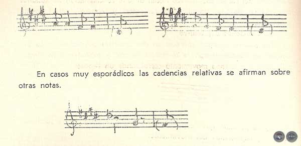 Las cadencias relativas y finales reposan sobre las notas que sirven de eje o "centro tonal" a todas las melodías, o sea sobre la nota Mí y Re y siempre a través de una progresión de carácter descendente.