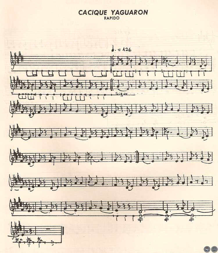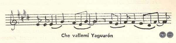 En el caso de "Cacique Yaguarón" tenemos dos temas, el primero tiene como polos de atracción un intervalo de cuarta justa, notas que se destacan como punto de "atracción tonal", quedando los demás sonidos como "puentes" entre uno y otro intervalo (Fa = — Sí):