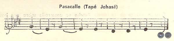 La presencia de "Pasacalle" —del nombre, más que de la forma y contenido— es evidente en cuanto al género de influencias. El Pasacalle es una composición musical de origen español, afirmada juntamente con la Chacona alrededor del 1600, consiste en variaciones sobre un bajo ostinado, de ritmo ternario y movimiento moderado, características que están totalmente ausentes en la presente composición que con el Tiempo pasó a denominarse en el repertorio de los Petekeros: 'Tapé Jehasé".