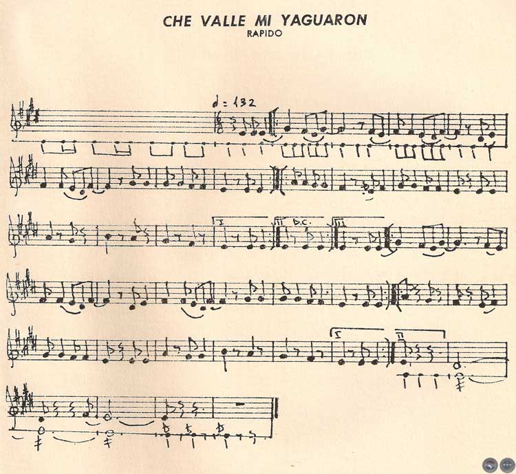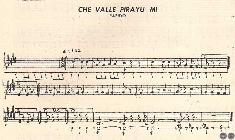 Llama poderosamente la atención la construcción de la pieza "Che valle Yaguarón" en la que aparecen muy tímidamente las síncopas, que en el caso de la polka paraguaya, y cuando vienen utilizadas en forma sistemática, reciben el nombre de "sincopado paraguayo". Esta fundamental característica de la música paraguaya que le imprime su carácter particular con respecto a las demás, está totalmente ausente en todas las otras piezas de los Peteke, hasta podríamos atrevernos a decir que "observando" detenidamente la construcción así como el carácter de "Che vallemí Yaguarón" que en esta forma se pudo haber realizado el proceso de transformación y fusión de los elementos hispano-guaraníes. Este ejemplo con esporádicas síncopas, subordinadas siempre al estilo particular de los Peteke pone en evidencia, por ser el producto de una absoluta transmisión oral los rasgos más interesantes que pudo haber seguido la música paraguaya para llegar a su actual forma, carácter y estilo.