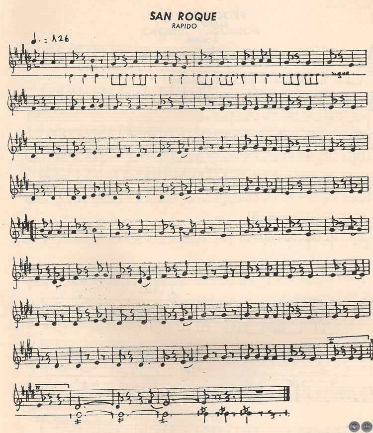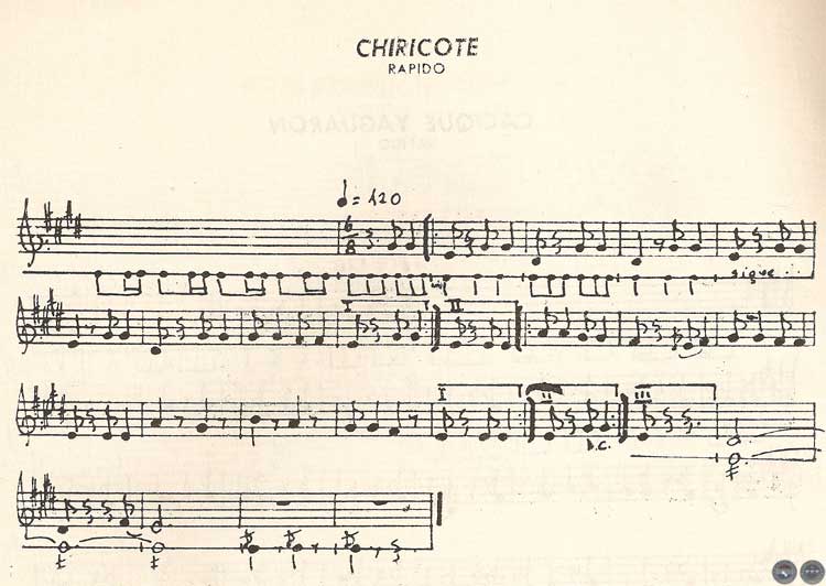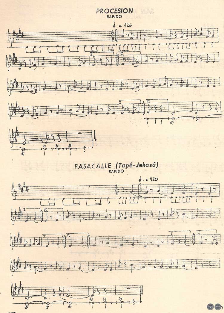 En "Procesión", "Pasacalle", "San Roque" y "Chiricóte" se nota la presencia de los centros tonales, fundamentalmente entre la tercera mayor (Mí — Sol =) y en forma secundaria en la tercera menor (Re = — Fa =). Inclusive en algunos casos la relación de varias notas conforma un arpegio mayor, es decir que el "concepto tonal" existe en forma natural y evidente: