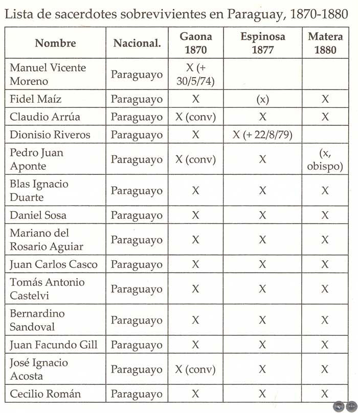 Concluye el libro con una interesante comparación de la lista de sacerdotes, tanto los que fallecieron en el campo de batalla como los que sobrevivieron, permitiendo dimensionar como el conflicto afectó al clero secular paraguayo.