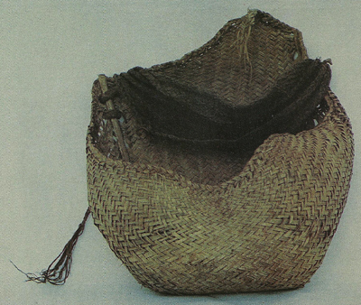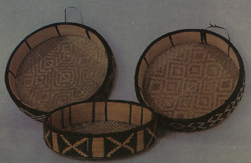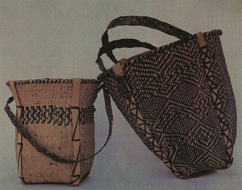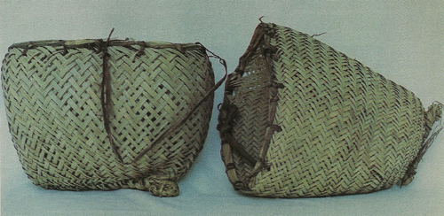 Los cestos son diferentes por su tamaño, tienen la forma algo triangular y no se aplican diseños ornamentales; la cestería es una tarea de la mujer.