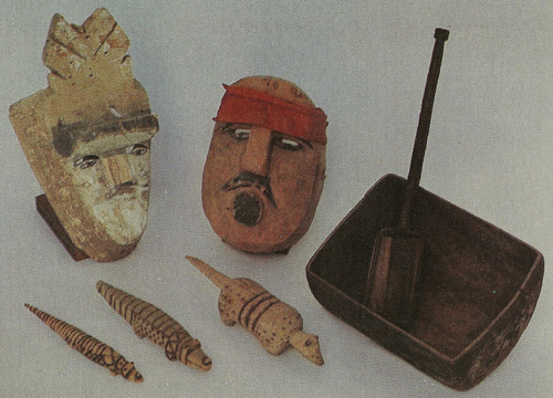 a) Máscaras Chiriguano-Guaraníes: Los Chiriguanos adoptaron, por la influencia de sus vasallos Chané-Arawak, el uso y la confección de las máscaras "añavusú", hechas de madera blanda "toroboki", de tallado fácil, imitando la cara humana en su faceta ceremonial. Antiguamente, tales máscaras correlacionábanse con el rito de la primicia del maíz, asegurando la protección de las ánimas de los muertos; con la aculturación, tales máscaras pasaron a ser "objetos del carnaval". Una de las máscaras está pintada con blanco de caolín y la otra representa a un Chiriguano con el "labrete-tembetá" y una vincha roja símbolo de autoridad y prestigio.