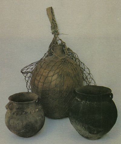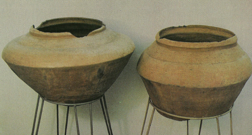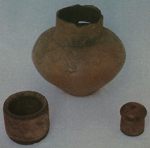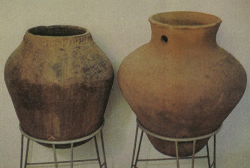 La lámina representa una vasija globular con cuello alto usado como recipiente para la chicha y dos potes cilíndricos con base anular.