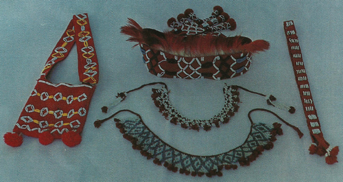 Tratándose de adornos, los chaqueños tendían a adoptar rápidamente cualquier materia prima del ambiente blanco, con tal que sirviera de "ostentación" socio-festival del hombre; siendo la mujer siempre algo desplazada en este aspecto. Los abalorios eran buscados por los indígenas ya al iniciarse los primeros contactos con los conquistadores. Los hombres Lenguas, Chulupíes, Makás yTobas confeccionaban anchas gargantillas de abalorios, sustituyendo las antiguas de carácter plumario; la moda del prestigio se impuso rápidamente. De base servía una redecilla de caraguatá, ensartándose los abalorios de color rojo, blanco o azul en forma ornamental, formando cuadros geométricos, lineales o cuadrangulares. El borde superior se reforzaba con lana roja, llevando grandes borlas de lana y recubiertas con abalorios.