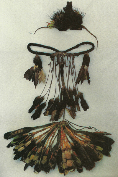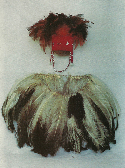 b) Las polleras de plumas de avestruz constituyen un adorno plumario típico para todos los chaqueños; se la ciñen solamente los hombres durante las danzas ceremoniales. Los Lenguas usan este tipo de adorno en la "danza de buenas canillas", realizada en ocasión de la conclusión de la fiesta iniciática de varones; la danza interpreta una competencia de los "canilleros", buenos caminantes, buenos corredores de campo y, por ende, buenos cazadores. A través de la mitología, el avestruz, como ave corredora, identifica al cazador.