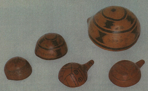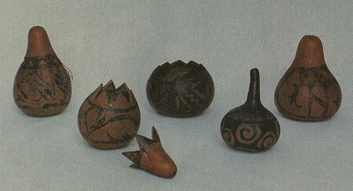 LAMINA Nº 25: Las Cuyas de los Chiriguanos-Guaraníes, calabazas partidas por la mitad, sirven de "vasos" para beber aloja de maíz o como cucharas. Las cuyas son pintadas en rojo de "urucú" y ornamentadas profusamente con incisiones simples o pirograbadas; los motivos decorativos son geométricos, zoomorfas o fitomorfos. La ornamentación de las cuyas era trabajo de los hombres, mientras que la alfarería corría a cargo de las mujeres.