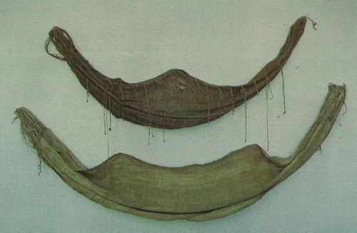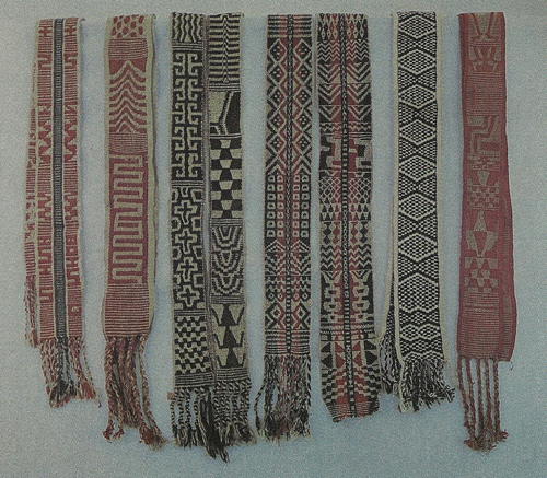 Otro tipo de gargantilla, bandas o vendas, componíanse de anchas bandas tejidas de lana roja, cosiéndose en su superficie abalorios en forma de ornamentación geométrica y algunas con emplumado en rojo; antiguamente tales bandas se cubrían con plaquitas de conchas.