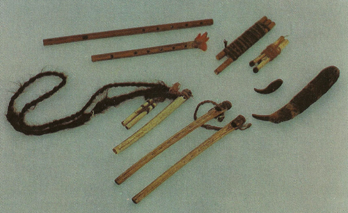 a) Las pequeñas flautas de Pan de los Achés se confeccionan de huesos de pájaros o de canutos de "tacuara". El hueso del alón de un Córvido se fracciona en tres trozos enlazados con un cordoncillo de fibras de ortiga brava. En la parte inferior, cada trozo es tapado con cera negra, tocándose a modo de "llave cerrada".