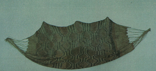 LAMINA Nº 15: Los Chaqueños usaban los cueros como echaderos; adoptaron la hamaca por influencia del ambiente blanco. Los Chamacocos usan generalmente plataformas levantadas como echaderos, pero adoptaron también hamacas hechas en labor de red de fibras de caraguatá, con mallas más o menos grandes. Se aplican los mismos diseños ornamentales como en las bolsas cargueras de caraguatá, siendo preferido el motivo en hexágono que simboliza las placas del caparazón de la tortuga o del armadillo.