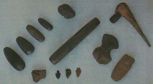 LAMINA N° 22: El material lítico de nuestras colecciones procede de Yaguarazapá, kuña Pirú y Tacurupucú (Alto Paraná), donde abundan los talleres líticos de cultura paleolítica, tipológicamente y cronológicamente. Entre el material recogido deben destacarse raederas, raspadores, pequeñas lascas-cuchillos, hachas de mano en forma curvada y las hachas en forma de un azadón para cavar raíces. En la zona de Tacurupucú se encontraron algunas puntas líticas de flechas y grandes pilones de piedra pulida o no, llamados "bastones de mando".