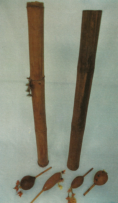 b) Para el bastón de ritmo se usa una vara de "tacuará" (Bambuácea) a la que sacan todos los nudos intermitentes, menos el último que forma el fondo del bastón. Tocándolo contra el suelo produce un sonido sordo de "jabalí"; el tono, en sí monótono, puede tener variaciones por medio del ritmo de los danzantes. En ocasiones ceremoniales, estos bastones llevan los flecos plumarios a modo de adornos. Entre los