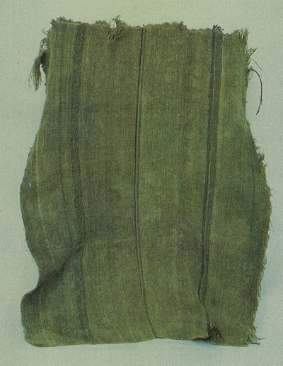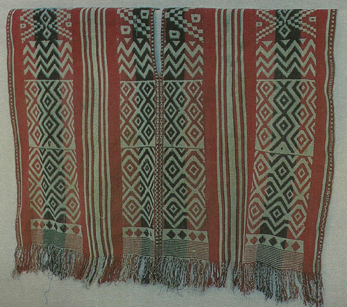 LAMINA N° 19: El tejido de lana es un ejemplo de laboriosidad manufacturera de los Chaqueños. Se desarrolló recién en la época colonial, cuando adoptaron a fines del siglo XVIII las ovejas, ya que la región chaqueña no era propicia para el cultivo del algodón. Como tejedores se destacaban los Lengua-Maskoy y los Chulupies, para su propio uso preferían grandes mantas de lana, largas de unos 2 mts y anchas de 1,5 mts, siendo principalmente una vestimenta socio-festival de los hombres; para el uso diario preferían simples mantillos utilitarios. Los motivos ornamentales de las mantas expresaban una "marca" de identificación tribal.