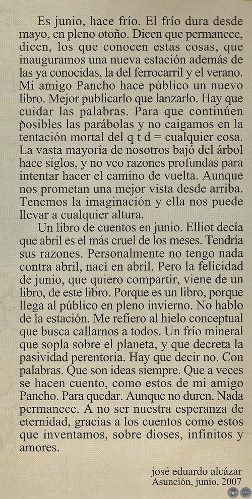 Un libro de cuentos en junio. Elliot decía que abril es el más cruel de los meses. Tendría sus razones. Personalmente no tendo nada contra abril, nací en abril. Pero la felicidad de junio, que quiero compartir, viene de un libro, de este libro. Porque es un libro, porque llega al público en pleno invierno: No hablo de la estación. Me refiero al hielo conceptual que busca callarnos a todos. Un frío mineral que sopla sobre el planeta, y que decreta la pasividad perentoria. Hay que decir no. Con palabras. Que son ideas siempre. Que a veces se hacen cuento, como estos de mi amigo Pancho. Para quedar. Aunque no duren. Nada permanece. A no ser nuestra esperanza de eternidad, gracias a los cuentos como estas que inventamos, sobre dioses, infinitos y amores