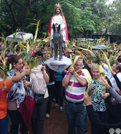 En todo el Paraguay, ese domingo, la gente acude a las iglesias a evocar aquel momento ocurrido antiguamente. Unos días antes, en las casas, se preparan los ramos hechos con hojas de una variedad de palmera muy común en el Paraguay y son esas palmas las que el sacerdote bendice el Domingo de Ramos.